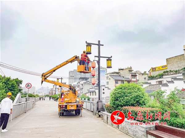 6月21日,安康市政園林處工作人員檢修路燈,營(yíng)造第二十三屆中國(guó)安康漢江龍舟節(jié)的節(jié)日氛圍。 胡波 攝