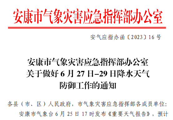 6月25日,安康市氣象災(zāi)害應(yīng)急指揮部辦公室發(fā)布《關(guān)于做好6月27日—29日降水天氣防御工作的通知》。