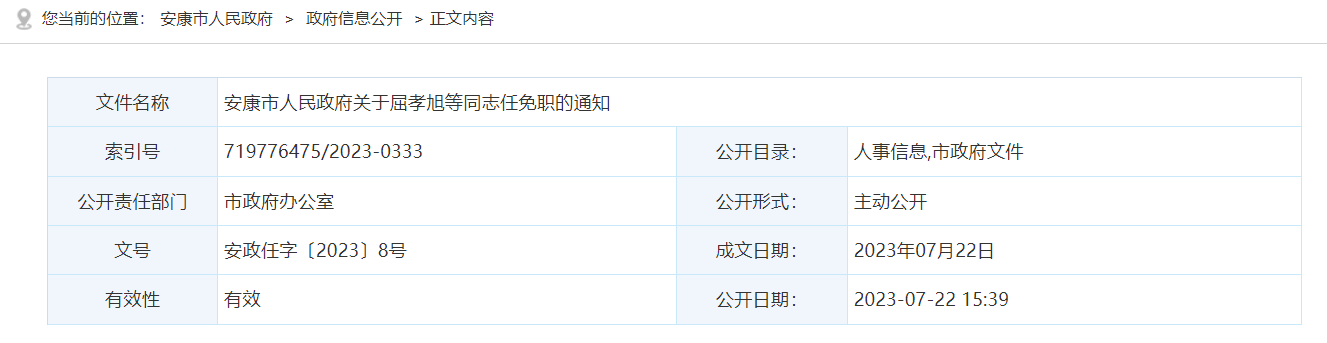 安康市人民政府關(guān)于屈孝旭等同志任免職的通知