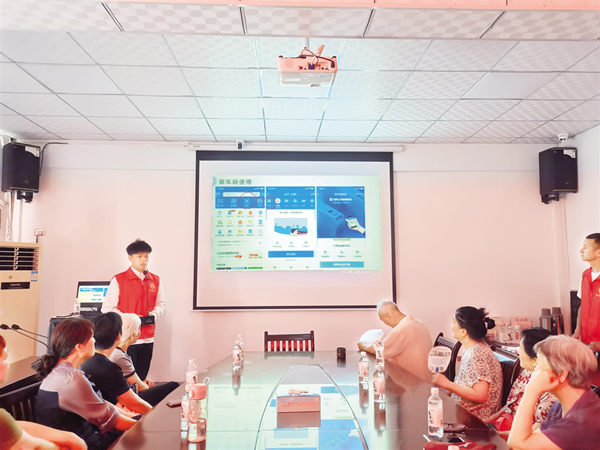 大學生志愿者趙子昊對照PPT教老年人使用智能手機APP。