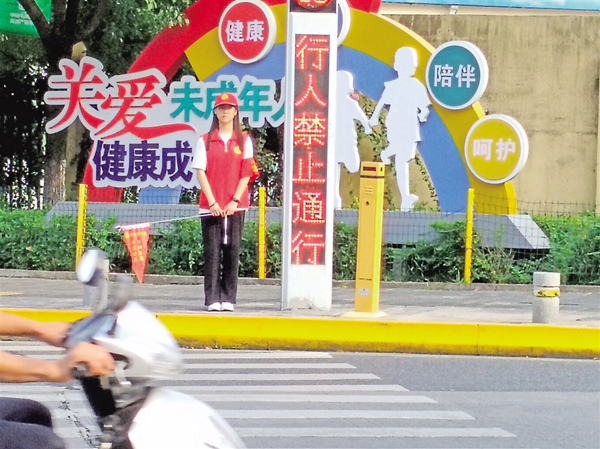 大學生志愿者劉沁怡在交通路口開展“文明交通”志愿服務。
