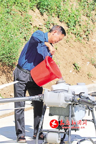 作為西河村獼猴桃園區(qū)負(fù)責(zé)人,69歲的何克祥正站在山路上指揮著無人機(jī)對園區(qū)果樹進(jìn)行飛防。