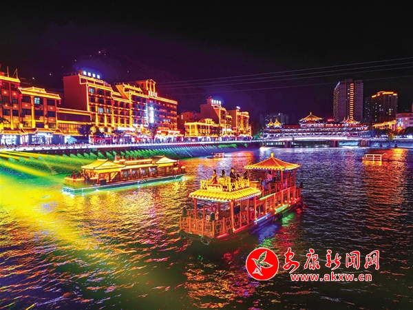 賽場內(nèi)氣氛熱烈,激情昂揚;賽場外活動多樣,異常精彩。賽事期間,嵐皋化身“不夜城”,琉璃燈火,璀璨夜色。每天傍晚,嵐皋“硒旺”號畫舫乘著晚風從碼頭緩緩出發(fā),在燈光輝映下流光溢彩,船上輕歌曼舞,為槳聲燈影里的嵐河平添了一道水上流動風景。嵐河兩岸紛紛開展各具特色的文旅活動,“嵐河夜畫”燈光秀把縣城裝扮得斑斕夢幻,花燈祈福、龍舟競渡等水上項目供游客參與體驗,cosplay、漢服、西游等主題巡游,處處飄蕩著歡聲笑語,各地游客在欣賞賽事的同時,享受到更多豐富多彩的娛樂生活。拍照、直播、發(fā)朋友圈,據(jù)不完全統(tǒng)計,賽事及相關活動吸引860余萬網(wǎng)民圍觀。
