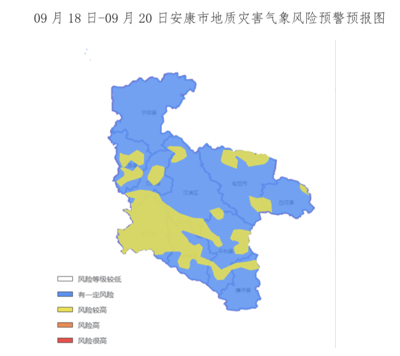 經安康市自然資源局、安康市氣象局9月18日14時聯(lián)合會商研判,我市漢濱區(qū)、紫陽縣、石泉縣、鎮(zhèn)坪縣、嵐皋縣、平利縣、漢陰縣、旬陽市、白河縣等地的部分地區(qū)地質災害氣象風險等級為Ⅲ級(較高風險),其他區(qū)域地質災害氣象風險等級為IV級(有一定風險)。請各部門按照各自職責做好地質災害防治工作。