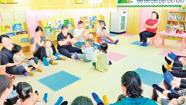 9月7日,在城關(guān)鎮(zhèn)旱壩村養(yǎng)育中心,家住附近的居民趙文婭每天都會帶著一歲四個月的孩子沈星宇來上課。