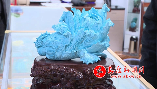 松石展柜中,擺放著各類精致時(shí)尚的綠松石飾品,這些通過雕刻家設(shè)計(jì)打磨后的擺件、項(xiàng)鏈、手鏈、耳墜等,都是藝術(shù)臻品,它們吸引著人們的目光,讓人愛不釋手。