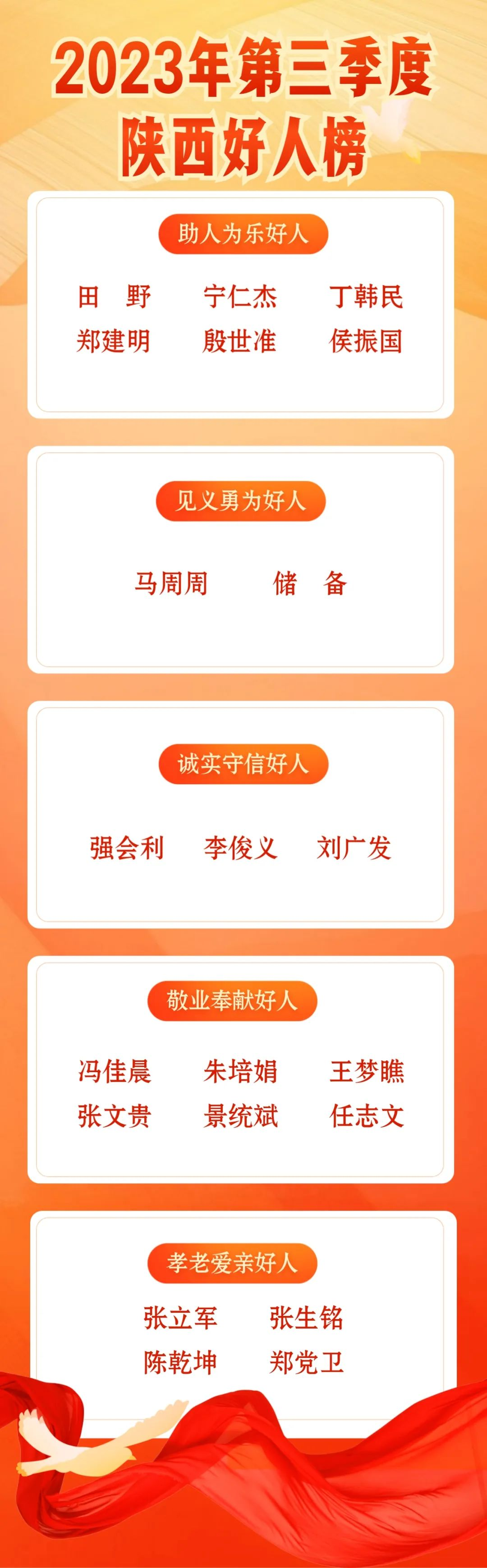 10月13日,2023年第三季度陜西好人榜發(fā)布儀式暨“奮進(jìn)新時(shí)代 聚力譜新篇”新時(shí)代文明實(shí)踐展演活動(dòng)在榆林陽(yáng)光廣場(chǎng)舉行。此次共有田野、強(qiáng)會(huì)利、馮佳晨等21名身邊好人登上第三季度“陜西好人榜”。其中,我市儲(chǔ)備、陳乾坤2人分別入選2023年第三季度“陜西好人榜”名單見(jiàn)義勇為好人、孝老愛(ài)親好人。