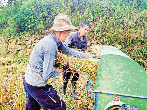 本網(wǎng)訊(記者 楊遷偉 孫妙鴻)風(fēng)吹稻田千重浪,又到一年秋收時(shí)。10月13日,記者來到漢陰縣蒲溪鎮(zhèn)盤龍村試種的90余畝“巨型稻”試驗(yàn)田,層層疊疊的稻田一片金黃,一株株高大的“巨型稻”傲然挺立,“個(gè)頭”明顯比旁邊稻田里普通水稻高出許多,長(zhǎng)而飽滿的稻穗低垂著迎風(fēng)搖擺,村民們正搶抓晴好天氣,加緊收割。
