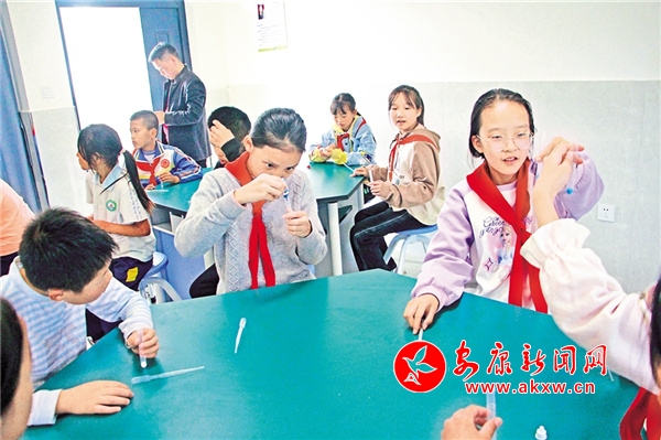 老縣鎮(zhèn)中心小學(xué)學(xué)生動手體驗酸堿中和實驗。 吳風(fēng)軍 攝