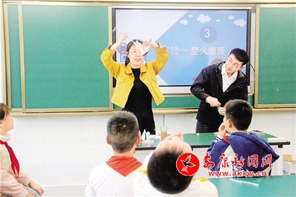 安康學(xué)院化學(xué)化工學(xué)院青年教師王雪博士、金成召博士為學(xué)生演示木棒復(fù)燃實驗。 吳風(fēng)軍 攝