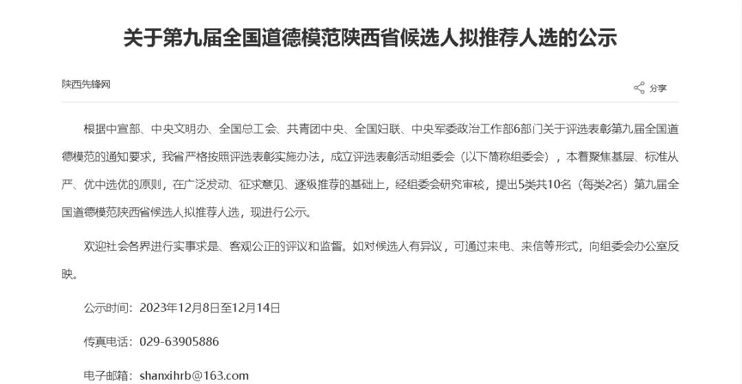 根據(jù)中宣部、中央文明辦、全國總工會、共青團(tuán)中央、全國婦聯(lián)、中央軍委政治工作部6部門關(guān)于評選表彰第九屆全國道德模范的通知要求,我省嚴(yán)格按照評選表彰實施辦法,成立評選表彰活動組委會(以下簡稱組委會),本著聚焦基層、標(biāo)準(zhǔn)從嚴(yán)、優(yōu)中選優(yōu)的原則,在廣泛發(fā)動、征求意見、逐級推薦的基礎(chǔ)上,經(jīng)組委會研究審核,提出5類共10名(每類2名)第九屆全國道德模范陜西省候選人擬推薦人選,現(xiàn)進(jìn)行公示。