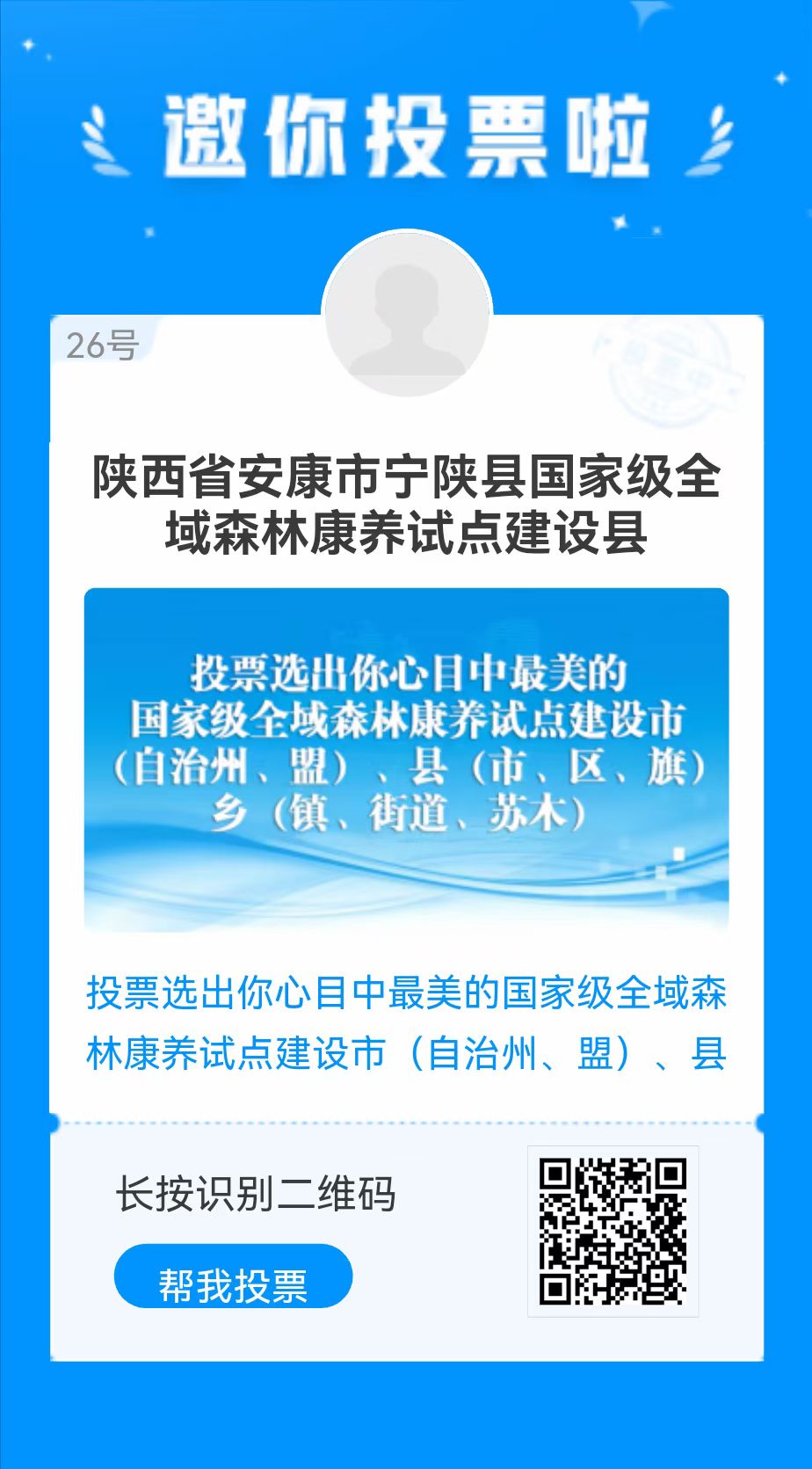 據(jù)了解,國(guó)家級(jí)森林康養(yǎng)試點(diǎn)建設(shè)單位認(rèn)定工作由中國(guó)林業(yè)產(chǎn)業(yè)聯(lián)合會(huì)負(fù)責(zé)開展,經(jīng)自愿申報(bào)、主管部門審核推薦、合規(guī)用地和安全經(jīng)營(yíng)專項(xiàng)檢查、當(dāng)?shù)毓、專家審查及認(rèn)定結(jié)果全國(guó)公示等程序,確定了2023年國(guó)家級(jí)森林康養(yǎng)試點(diǎn)建設(shè)單位名單。同時(shí)還開設(shè)投票活動(dòng),選出大眾心目中最美的國(guó)家級(jí)森林康養(yǎng)試點(diǎn)建設(shè)基地和中國(guó)森林康養(yǎng)人家,請(qǐng)為森林履蓋率全國(guó)第一的“秦嶺之心 綠都寧陜”投上您寶貴的3票。ㄩL(zhǎng)按二維碼即可投票,每個(gè)微信號(hào)每天可投3票)