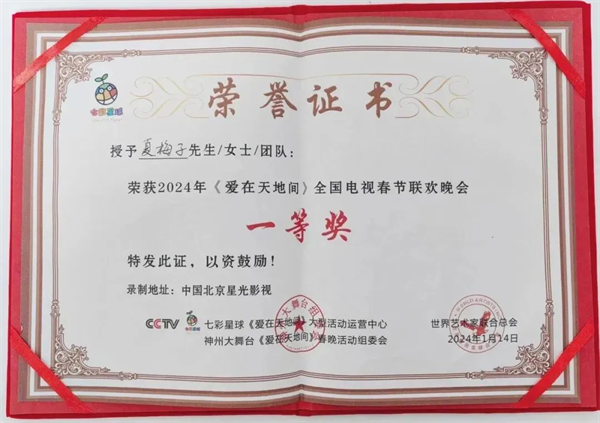 1月15日,《愛在天地間》全國電視春節(jié)聯(lián)歡晚會在京錄制圓滿成功。晚會由劉相周擔(dān)任總導(dǎo)演,邀請有春雷、王琪、烏蘭托婭、夏梅子等多位嘉賓,分別表演了多個(gè)精彩節(jié)目。夏梅子在這次晚會上演唱了陜南民歌《幸福歌兒唱安康》并榮獲一等獎(jiǎng)。