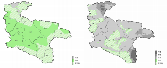 △ 圖1:1月31日08時(shí)-2月1日08時(shí)降水落區(qū)預(yù)報(bào)圖;圖2:2月1日08時(shí)-2日08時(shí)降水落區(qū)預(yù)報(bào)圖