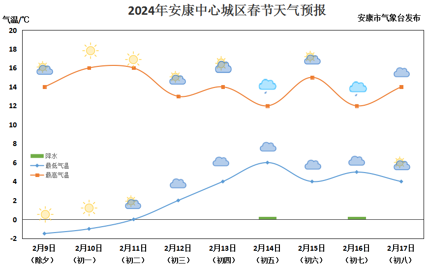 春節(jié)期間冷空氣對我市影響較小,最高氣溫起伏不大,預(yù)計川道地區(qū) 11~18℃,秦巴山區(qū):8~14℃,最低氣溫初三以前相對較低,后期有所升高:川道地區(qū) -2~5℃,秦巴山區(qū):-5~1℃。