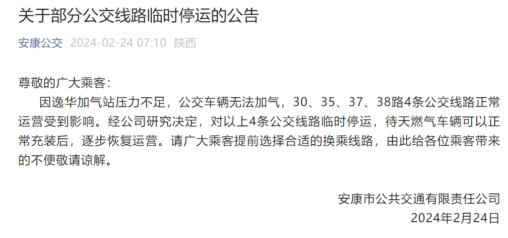 2月24日7時(shí),市公交公司發(fā)布通知:因逸華加氣站壓力不足,公交車輛無法加氣,30、35、37、38路4條公交線路正常運(yùn)營(yíng)受到影響。經(jīng)公司研究決定,對(duì)以上4條公交線路臨時(shí)停運(yùn),待天燃?xì)廛囕v可以正常充裝后,逐步恢復(fù)運(yùn)營(yíng)。2nF安康新聞網(wǎng)