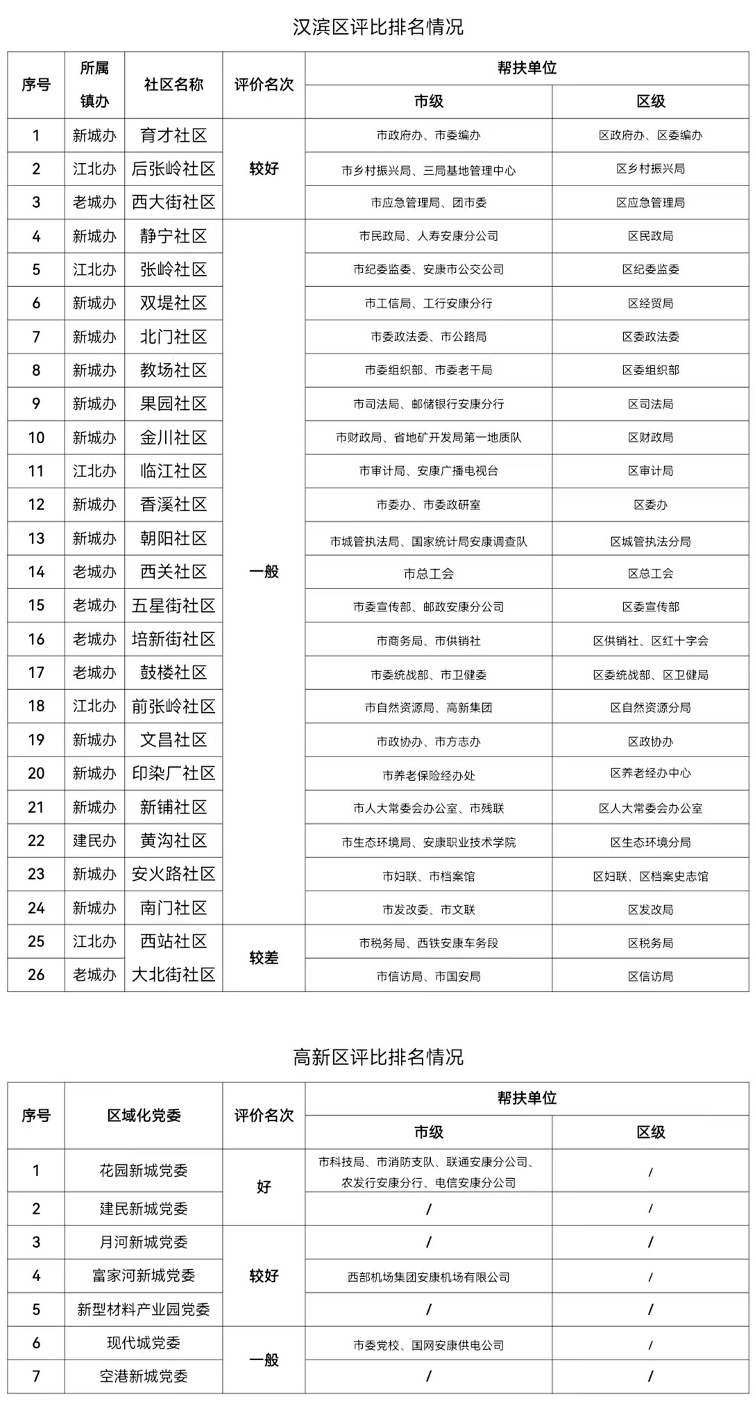 (一)漢濱區(qū):本周隨機對54個社區(qū)(村)中的26個社區(qū)(村)進行了評比排名。