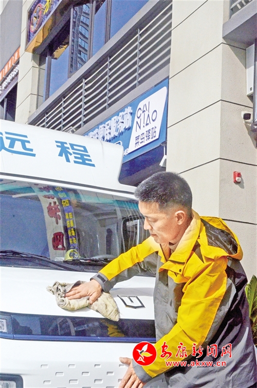 ④新能源貨車駕駛員王道鵬正在清潔車輛。記者 陳楚珺 攝