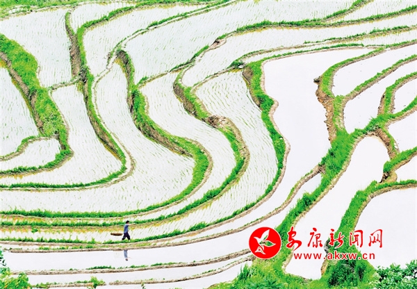 來鳳堰梯田最好的時(shí)候,就是等到灌水插秧的時(shí)候。規(guī)模宏大的梯田,如同蘸了水的綢帶,飄逸靈動(dòng)、若隱若現(xiàn),一縷縷的陽光灑在梯田之上,讓插秧的水都泛著金光。