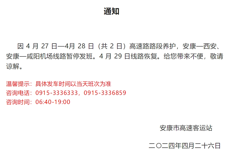 4月26日,安康高速客運站發(fā)布通知: