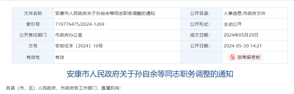 安康市人民政府關(guān)于孫自余等同志職務調(diào)整的通知