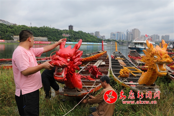 安康市體育服務(wù)管理中心主任、安康龍舟節(jié)主題活動(dòng)水上導(dǎo)演劉平平介紹:“今天28支龍舟隊(duì)集結(jié)下水,下水后要安裝龍頭、龍尾、鑼架、鼓架和棹,達(dá)到翹頭翹尾的最美觀感。然后我們就要開始進(jìn)行試水、適應(yīng)性訓(xùn)練、表演訓(xùn)練和比賽項(xiàng)目訓(xùn)練,爭(zhēng)取達(dá)到最佳的狀態(tài)參加比賽”。
