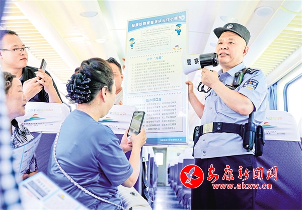 “我已經(jīng)發(fā)展了三個志愿者!”老范一邊興高采烈地說著,一邊從他的工作包中找出志愿者袖標(biāo)及徽章。就在剛才,在站臺上引導(dǎo)旅客上車的老范憑著自己的親和力,很快就物色了幾名自愿擔(dān)任平安列車志愿者的旅客。老范隨后給志愿者佩戴袖標(biāo)及徽章,給他們開展崗前培訓(xùn),帶他們在列車上開展反詐和防盜等安全宣傳。