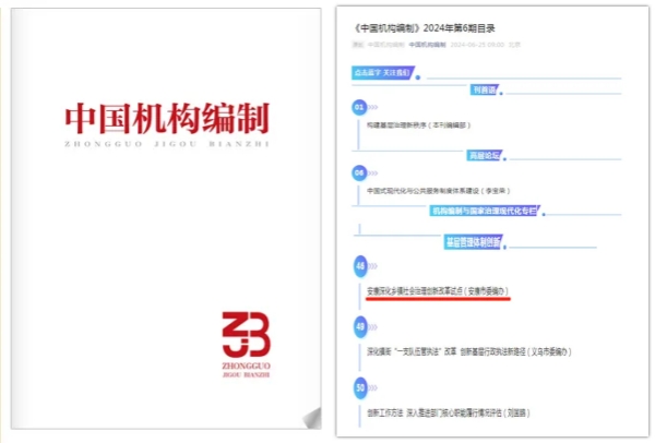 6月25日,《中國(guó)機(jī)構(gòu)編制》2024年第6期以題為《安康深化鄉(xiāng)鎮(zhèn)社會(huì)治理創(chuàng)新改革試點(diǎn)》刊發(fā)我市深化鄉(xiāng)鎮(zhèn)社會(huì)治理創(chuàng)新改革試點(diǎn)經(jīng)驗(yàn)文章,這也是繼《安康推進(jìn)機(jī)構(gòu)編制監(jiān)督檢查全覆蓋》、《部門機(jī)構(gòu)編制事項(xiàng)動(dòng)議初探》、《深化審批服務(wù)便民化改革》,我市機(jī)構(gòu)編制管理創(chuàng)新經(jīng)驗(yàn)和調(diào)研成果第四次在全國(guó)機(jī)構(gòu)編制系統(tǒng)最高權(quán)威期刊“上榜”。