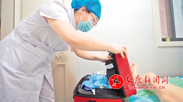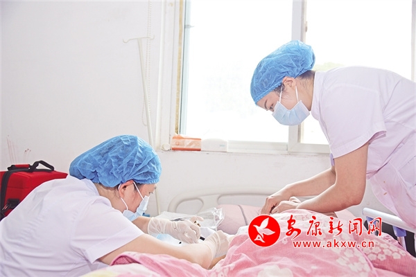 十幾分鐘后,白河縣人民醫(yī)院PICC?谱o(hù)士袁茜和杜曉雨帶著醫(yī)藥箱趕到城關(guān)鎮(zhèn)廣興金座8號(hào)樓3層樊阿姨家里。