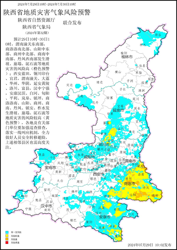 陜西省自然資源廳與陜西省氣象局聯(lián)合發(fā)布地質(zhì)災(zāi)害氣象風(fēng)險(xiǎn)預(yù)警:7月29日10時(shí)至7月30日10時(shí),下圖所示縣(區(qū))可能發(fā)生地質(zhì)災(zāi)害:其中我市漢濱、白河、旬陽(yáng)、平利、嵐皋、鎮(zhèn)坪發(fā)生滑坡、崩塌、泥石流等地質(zhì)災(zāi)害的風(fēng)險(xiǎn)較高(黃色預(yù)警),各地及有關(guān)部門(mén)單位要加強(qiáng)巡查排查,落實(shí)一線(xiàn)叫應(yīng)機(jī)制,全力做好人員安全轉(zhuǎn)移避險(xiǎn),上述相鄰縣區(qū)也需高度關(guān)注。