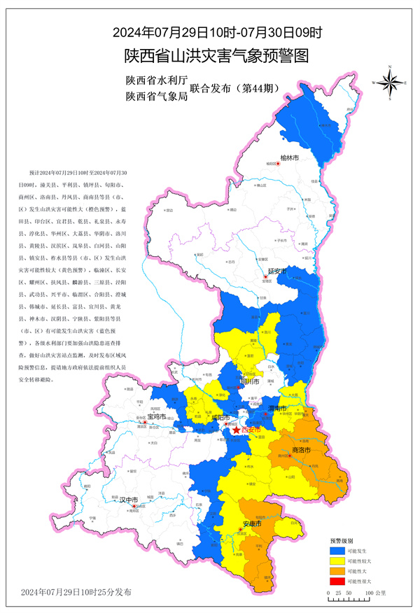 陜西省水利廳與陜西省氣象局聯(lián)合發(fā)布山洪災(zāi)害氣象預(yù)警:預(yù)計(jì)7月29日10時(shí)至7月30日9時(shí),下圖中所示縣(區(qū))可能發(fā)生山洪災(zāi)害,其中我市漢濱區(qū)、嵐皋縣、白河縣發(fā)生山洪災(zāi)害可能性較大(黃色預(yù)警),漢陰縣、寧陜縣、紫陽(yáng)縣有可能發(fā)生山洪災(zāi)害(藍(lán)色預(yù)警),各級(jí)水利部門(mén)要加強(qiáng)山洪隱患巡查排查,做好山洪災(zāi)害站點(diǎn)監(jiān)測(cè),及時(shí)發(fā)布區(qū)域風(fēng)險(xiǎn)預(yù)警信息,地方政府應(yīng)依法提前組織人員安全轉(zhuǎn)移避險(xiǎn)。