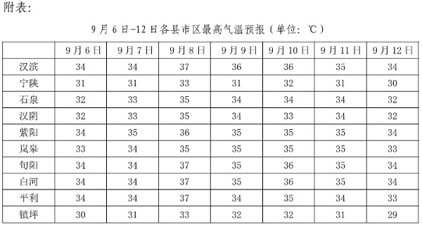 本網(wǎng)訊 9月6日12時(shí),市氣象臺(tái)發(fā)布重要天氣報(bào)告:根據(jù)最新氣象觀測(cè)資料和數(shù)值預(yù)報(bào)分析,預(yù)計(jì)我市未來(lái)一周無(wú)區(qū)域性有效降水,仍維持晴熱少雨,8-11日將出現(xiàn)35℃以上高溫天氣,局地最高氣溫可達(dá)38℃以上;秦嶺和巴山沿線午后到夜間多分散性強(qiáng)對(duì)流性天氣,局地伴有短時(shí)強(qiáng)降水(10~30 毫米/小時(shí))和雷暴大風(fēng)天氣。