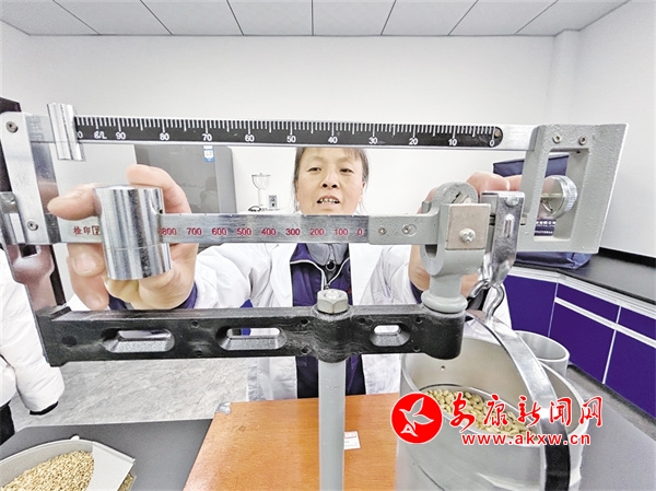 實驗質檢員利用糧食扦樣器、取樣容器、分樣器、容重器、鏡紅外谷物分析儀、面筋儀、電動選篩、真菌毒素檢測儀器等一系列設備對扦取的樣品進行了質量和儲存品質檢驗,針對小麥水分、容重、不完善粒、雜質、真菌毒素等項目進行常規(guī)檢查。