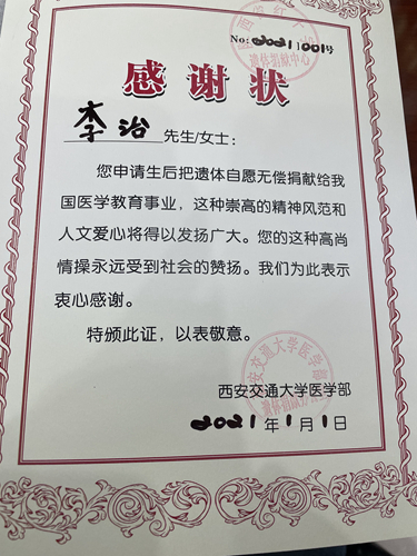 15年來(lái),李治還積極資助困難學(xué)生、為災(zāi)區(qū)捐資捐物,為他人、為社會(huì)付出了很多,但他總覺(jué)得不夠。2021年,他自愿申請(qǐng)并成功登記為遺體捐獻(xiàn)志愿者。“這是我那年送給自己的新年禮物。”他指著西安交通大學(xué)醫(yī)學(xué)部的感謝狀說(shuō)。