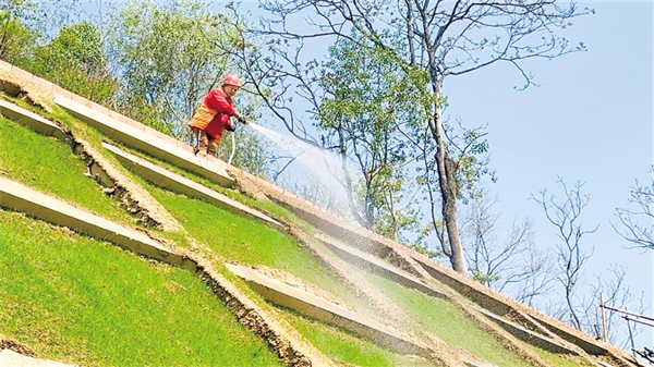 在“安康湖”博物館段南側(cè)生態(tài)修復(fù)工程現(xiàn)場(chǎng),記者看到,這面曾經(jīng)因風(fēng)化裸露存在安全隱患的山體,如今通過(guò)噴漿、格構(gòu)梁護(hù)坡再覆綠的“地質(zhì)縫合術(shù)”重獲新生。
