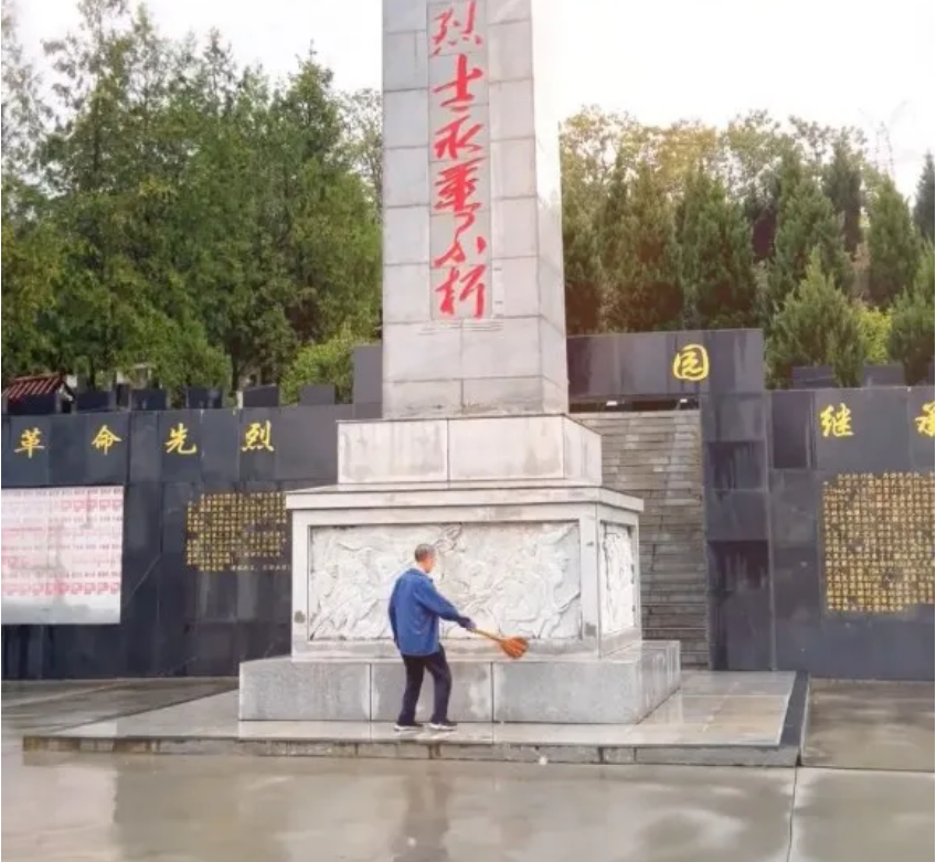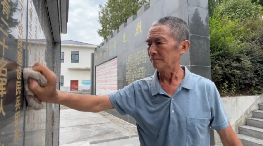 9月5日,守陵人王開茂在烈士陵園擦拭紀念碑。(圖片來源:嵐皋縣融媒中心)