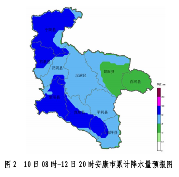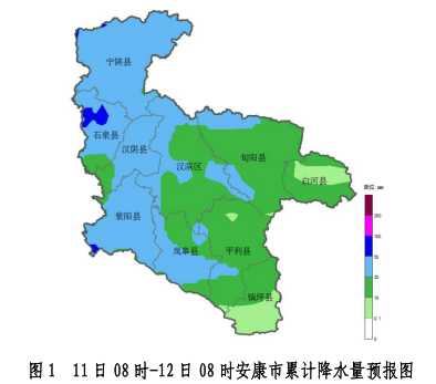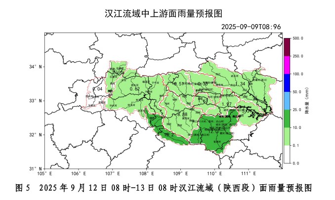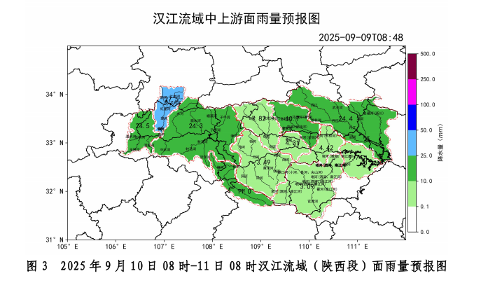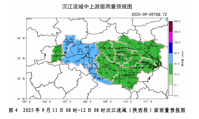 預計10日08時-11日08時漢江流域(陜西段)大部面雨量0.1~10毫米,玉帶河、酉水河、子午河、任河流域面雨量10-25毫米,褒河流域面雨量25-50毫米(圖3);11日08時-12日08時漢江流域(陜西段)褒河、酉水河、子午河、任河面雨量25~50毫米,其余中小河流流域面雨量10~25毫米(圖4);12日08時-13日08時漢江流域(陜西段)任河、堵河流域面雨量達10~25毫米,其余中小河流流域面雨量0.1~10毫米(圖5)。