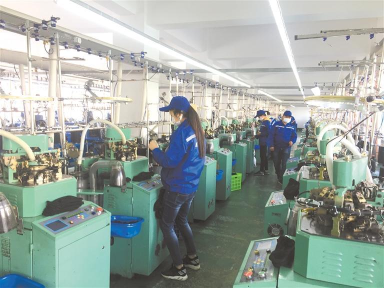 裝上棉紗、調(diào)好數(shù)據(jù)、按下開關(guān),只見織襪機(jī)齒輪開始飛速運轉(zhuǎn)、針筒反復(fù)運動……不到3分鐘便有了襪子的雛形。次日一早,負(fù)責(zé)縫頭的農(nóng)戶便會上門取走襪胚,進(jìn)行下一……