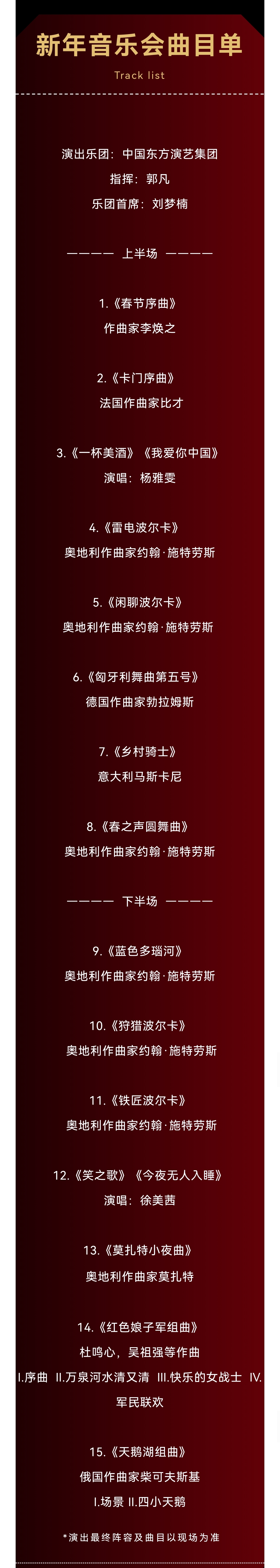 本場(chǎng)音樂會(huì)以“喜迎新年”為篇章,精粹二十首左右的中外“新年代表”經(jīng)典樂曲,獨(dú)具中國東方韻味的名曲和維也納新年音樂會(huì)的傳統(tǒng)樂曲,曲目中西合璧,加入極富創(chuàng)意的樂曲編排,歡快宏大、激情洋溢的音樂風(fēng)格,讓跨年氛圍與交響融合得渾然一體,在歡樂喜悅的音樂旋律中表達(dá)對(duì)新年新氣象的期盼與向往。