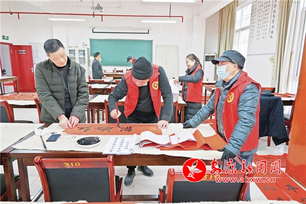 走貧困村、進社區(qū)、上街頭為群眾義寫春聯(lián)是市老干中心(安康老年大學)每年辭舊迎新的傳統(tǒng)活動。今年,按照疫情防控有關要求,為盡量減少人員聚集,活動當天,書畫學會臨時黨支部組織書畫系10名優(yōu)秀學員和黨員骨干志愿者在學校書畫教室統(tǒng)一創(chuàng)作。他們用半天時間創(chuàng)作了近200幅春聯(lián),“與其千里返鄉(xiāng)隔離十四天,不如就地打工多賺五六千,就地過年好”等一幅幅緊扣當下、通俗易懂的“抗疫”春聯(lián)與謳歌新時代、弘揚新民風、傳承民俗文化的主題相結合,充分體現了廣大老同志桑榆未晚、發(fā)揮余熱的精神風貌及康樂有為、樂善有恒的志愿服務精神。