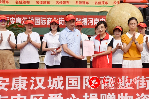 本網訊 8月4日9時,一場馳援河南的愛心捐贈儀式在安康漢城國際商業(yè)街舉辦,安康市紅十字會、市工商聯(lián)、市應急管理局、陜西安康博泰投資有限公司領導及漢城國際商業(yè)街商戶、員工代表共同見證了物資、資金移交過程。