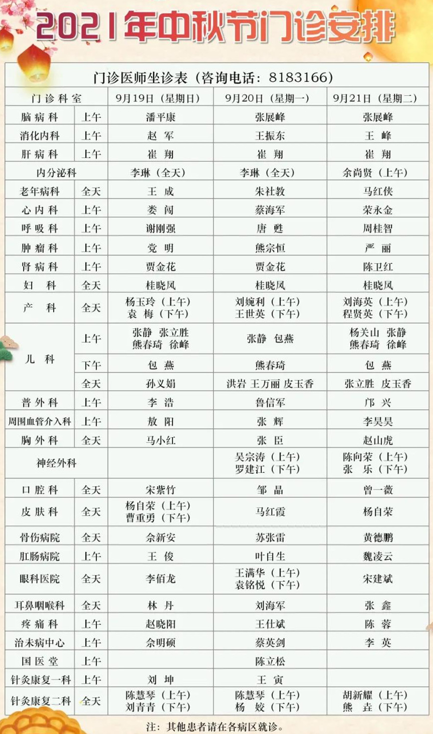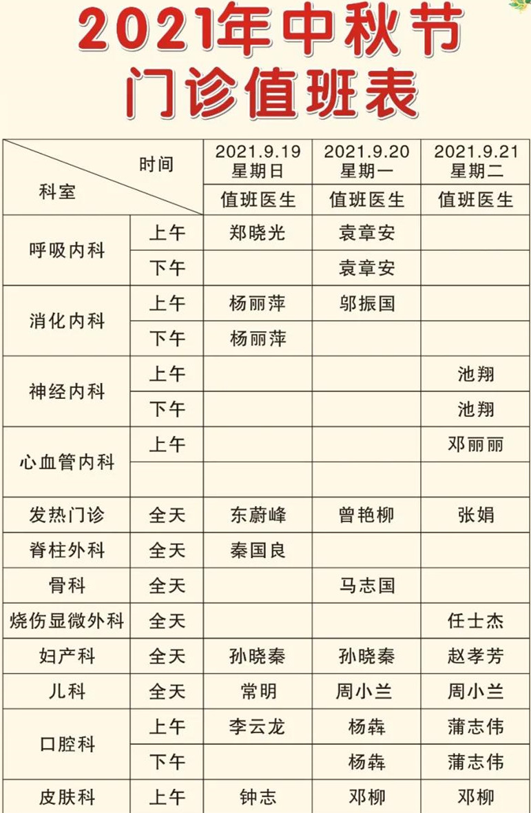 經醫(yī)院研究決定,9月19日(星期日)至21日(星期二)中秋節(jié)放假調休3天,9月18日(星期六)正常上班,執(zhí)行周一門診排班。