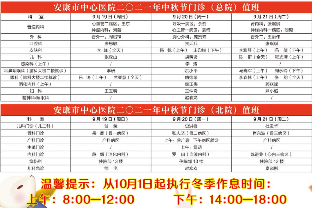 本網訊(通訊員 黃申奧)2021年農歷中秋佳節(jié)將至,為保障人民群眾身體健康,方便群眾節(jié)假日期間就醫(yī)就診,安康市中心醫(yī)院、安康市人民醫(yī)院、安康市中醫(yī)醫(yī)院等陸續(xù)發(fā)布中秋假期放假通知及門診排班安排。