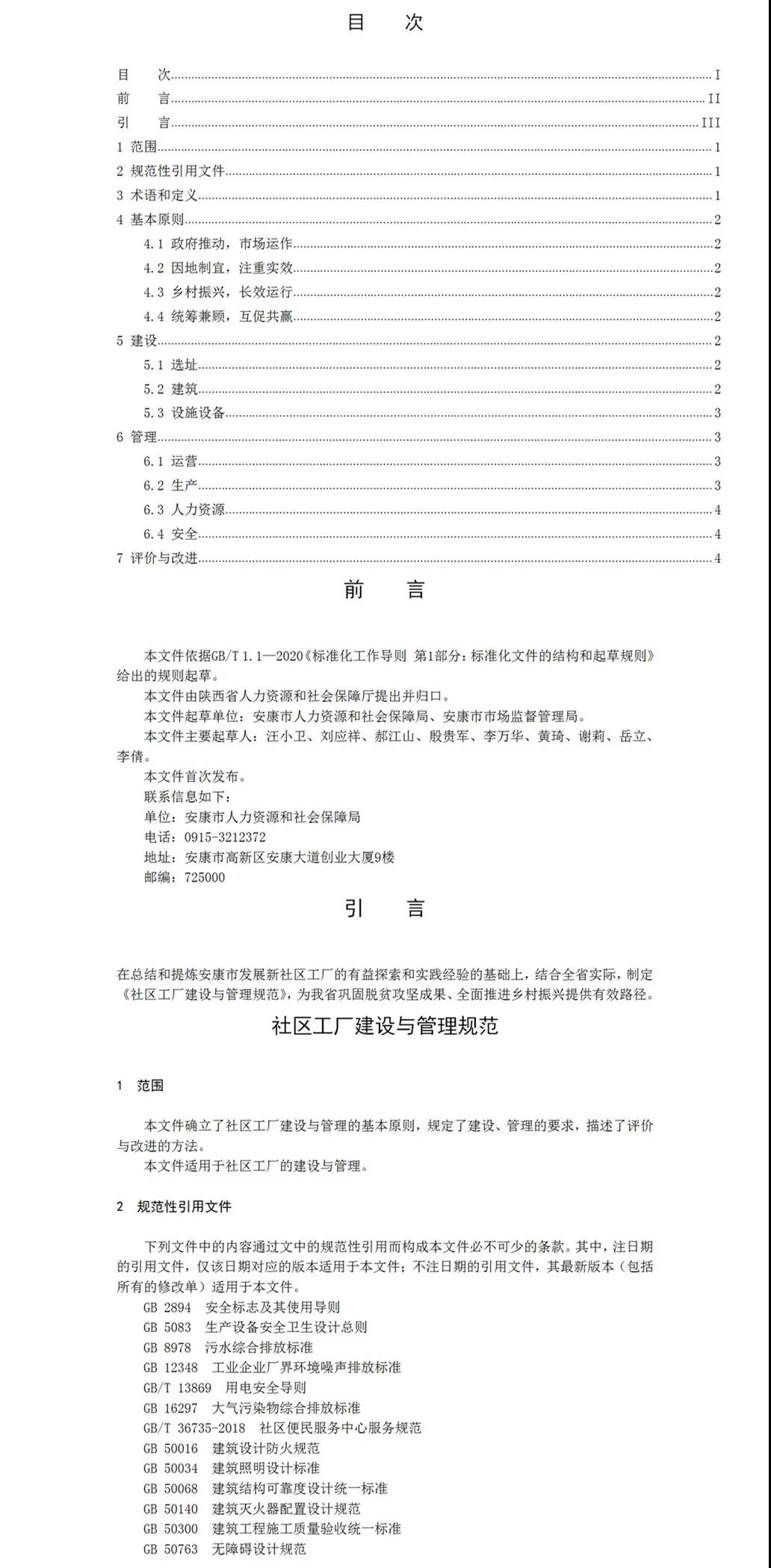 2020年6月,安康市人社局申請(qǐng)陜西省地方標(biāo)準(zhǔn)的立項(xiàng),同年7月,陜西省市場(chǎng)監(jiān)督管理局批準(zhǔn)同意該標(biāo)準(zhǔn)制定。安康市人社局聯(lián)合安康市市場(chǎng)監(jiān)督管理局共同成立標(biāo)準(zhǔn)起草組,形成標(biāo)準(zhǔn)草案。歷時(shí)兩年時(shí)間在全省范圍內(nèi)實(shí)地調(diào)研,通過(guò)書面征求意見,反復(fù)修訂完善,專家評(píng)議審查等程序,最終形成報(bào)批稿。該標(biāo)準(zhǔn)分別從范圍、規(guī)范性引用文件、術(shù)語(yǔ)與定義、基本原則、建設(shè)、管理、評(píng)價(jià)與改進(jìn)等七方面對(duì)社區(qū)工廠的建設(shè)與管理予以規(guī)范明確。