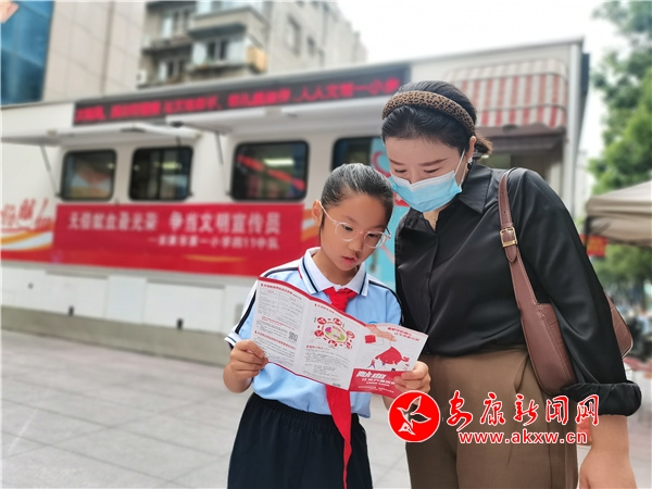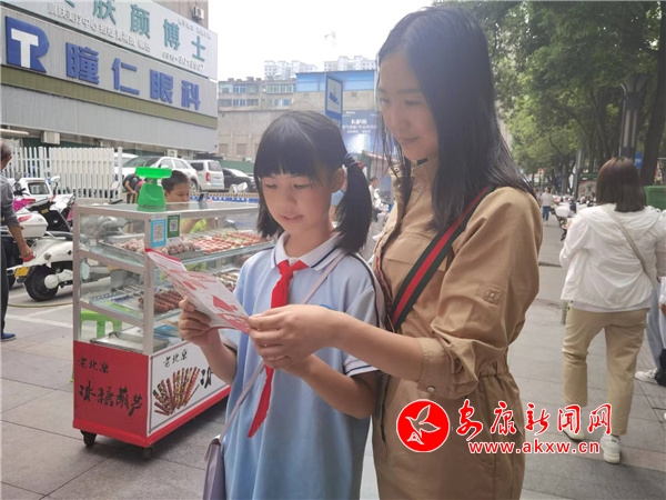 之后,孩子們拿著宣傳冊,進(jìn)入商場、賓館等,向行人、工作人員分發(fā)宣傳冊。