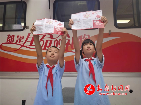 隨后,在采血車內(nèi),醫(yī)務(wù)人員從血液成分、獻(xiàn)血條件、獻(xiàn)血流程等方面為孩子們現(xiàn)場講解。孩子們?yōu)橹驹刚攉I(xiàn)花,表達(dá)敬意。