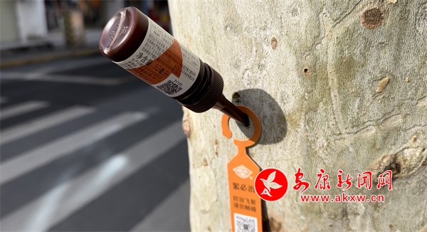在城區(qū)育才路,市政園林工作人員先在法桐的樹干上斜鉆出一個數(shù)厘米深的小洞,然后把一支褐色瓶子插在樹洞中。安康市市政園林處綠化管護科副科長龔晨曦介紹,給法桐注射的藥物名叫“絮必治”,通過插瓶輸液法,在樹干打孔,把藥劑輸入樹體內(nèi),藥劑會隨著蒸騰作用擴散到樹體各部分,抑制花芽形成,從而不開花結(jié)果,達(dá)到控制懸鈴木飛絮的目的。今年計劃對城區(qū)500株法桐進行試點打藥,其原理就是通過藥物不讓果實成熟,也就不會有飛絮。同時也會采用修剪枝葉、夏季夜間高壓水槍噴水等方式,最大限度緩解法桐飛絮漫天飛舞擾民的現(xiàn)象,逐年逐步減少對市民的影響。