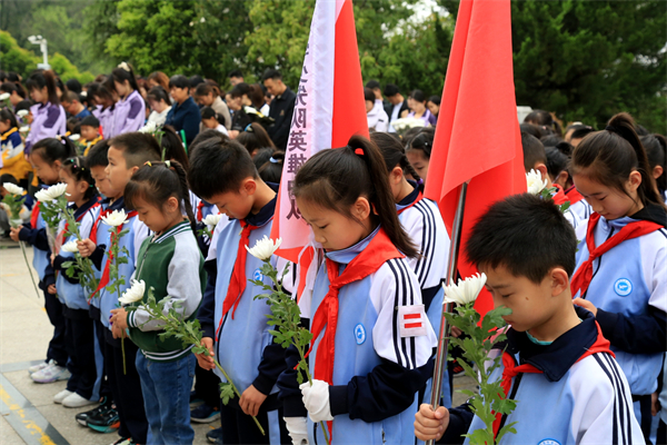 全體師生列隊(duì)紀(jì)念碑前,為革命先烈獻(xiàn)花默哀。每一個(gè)人的心中都在向革命先烈們曾經(jīng)所經(jīng)歷的風(fēng)霜雪雨、艱苦磨難致敬,為他們復(fù)興中華、赴湯蹈火的崇高精神致敬。