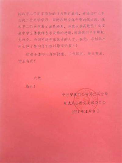 據(jù)悉,安康中學(xué)高二13班鄒遠濤、陳和平同學(xué)于4月5日下午在金州北路撿到裝有身份證件、銀行卡及大量現(xiàn)金的錢包后,積極上交公安機關(guān)并協(xié)助尋找失主。經(jīng)公安機關(guān)查找,迅速將錢包物歸原主。4月8日,漢濱分局東城派出所黨支部送來了感謝信,表揚兩位同學(xué)的高尚行為。