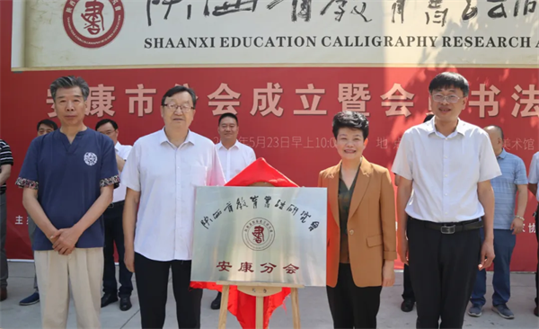 陜西省教育書(shū)法研究會(huì)名譽(yù)會(huì)長(zhǎng)陳云龍、馬西平,安康市教育體育局黨委書(shū)記、局長(zhǎng)屈曉紅,安康中學(xué)校長(zhǎng)朱平共同為安康分會(huì)揭牌。
